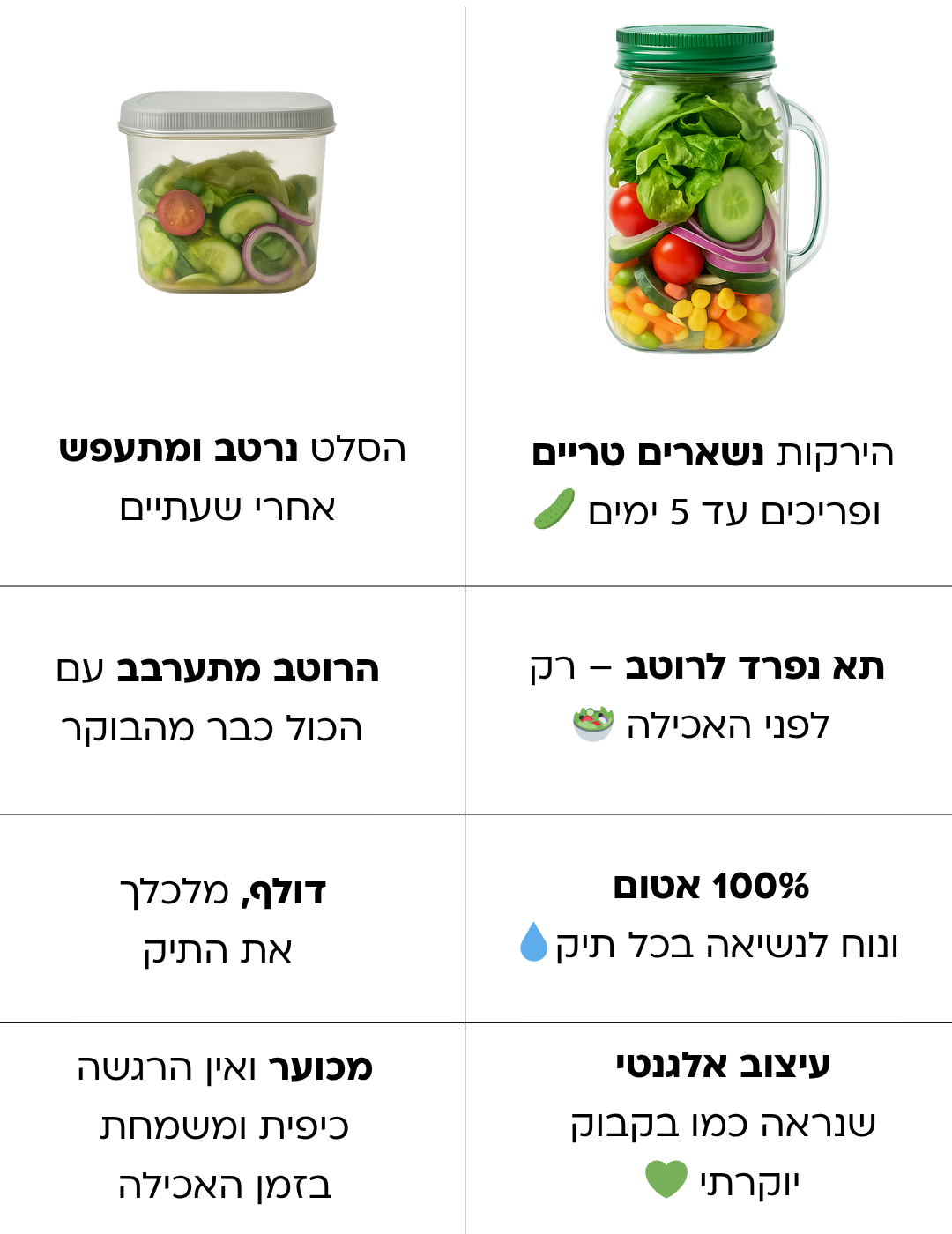 המיכל גדול ומרווח, נכנס בו סלט אמיתי, משביע וטעים. מושלם לארוחה שלמה – לא "נשנוש".