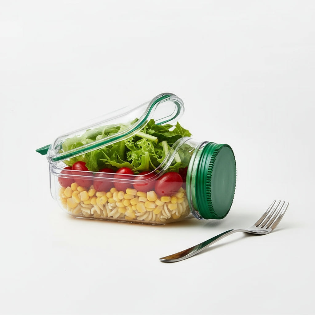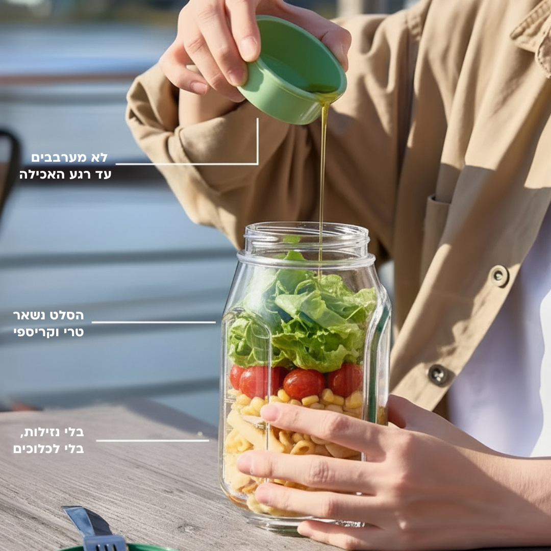 העיצוב החכם בשכבות מונע מהירקות לגעת ברוטב עד הרגע האחרון, וכך הכל נשאר רענן וקריספי — גם אחרי שעות.